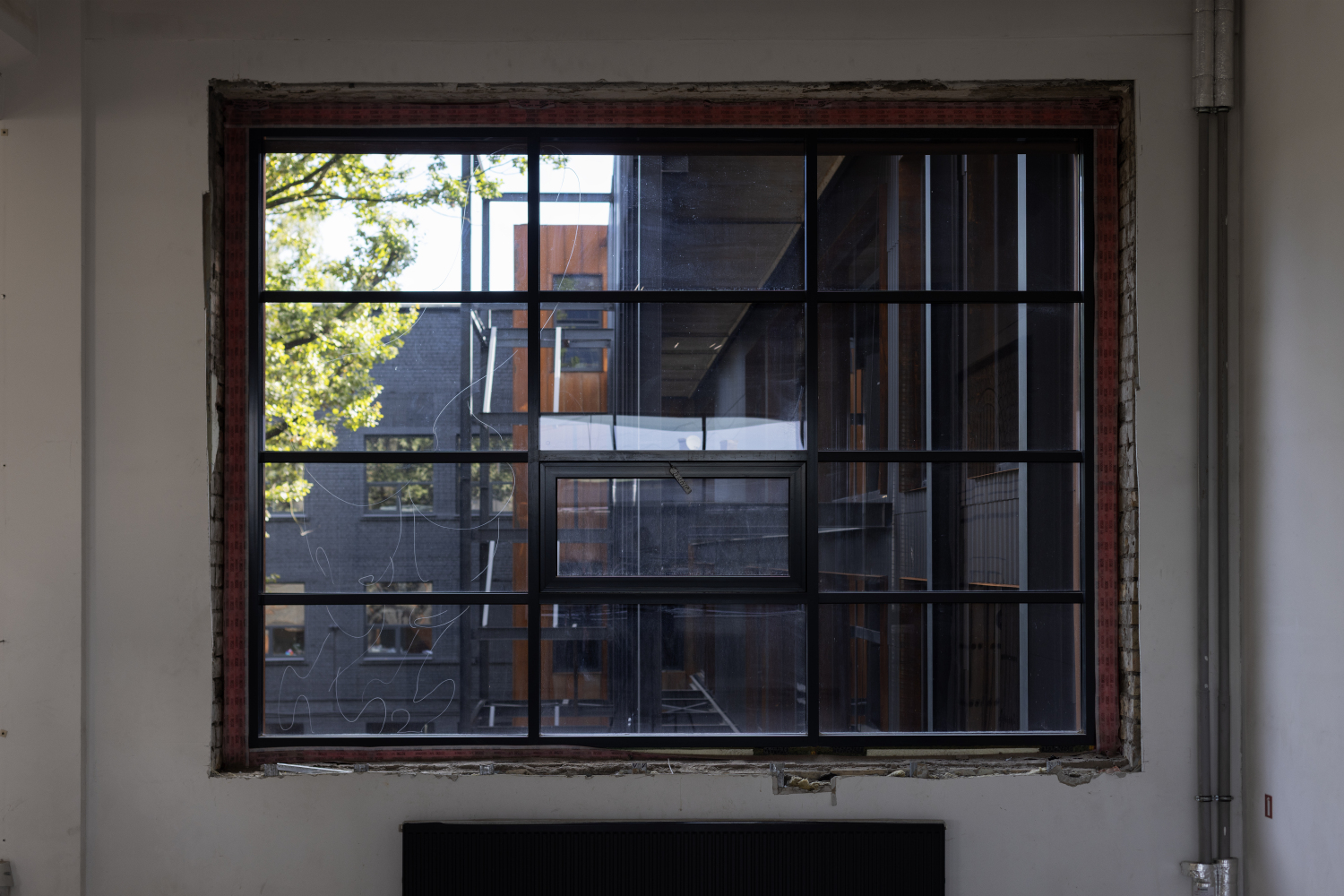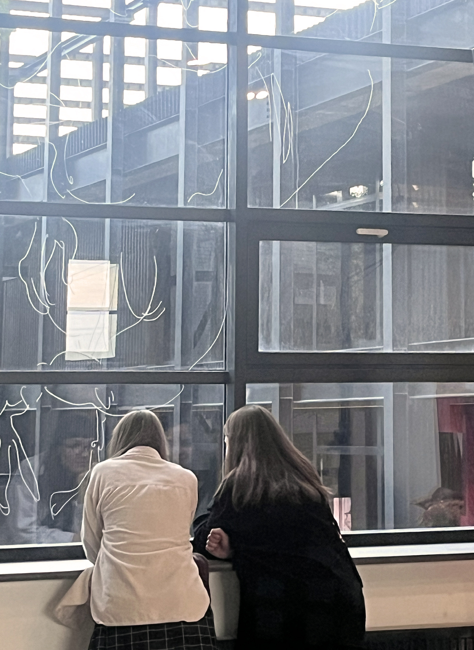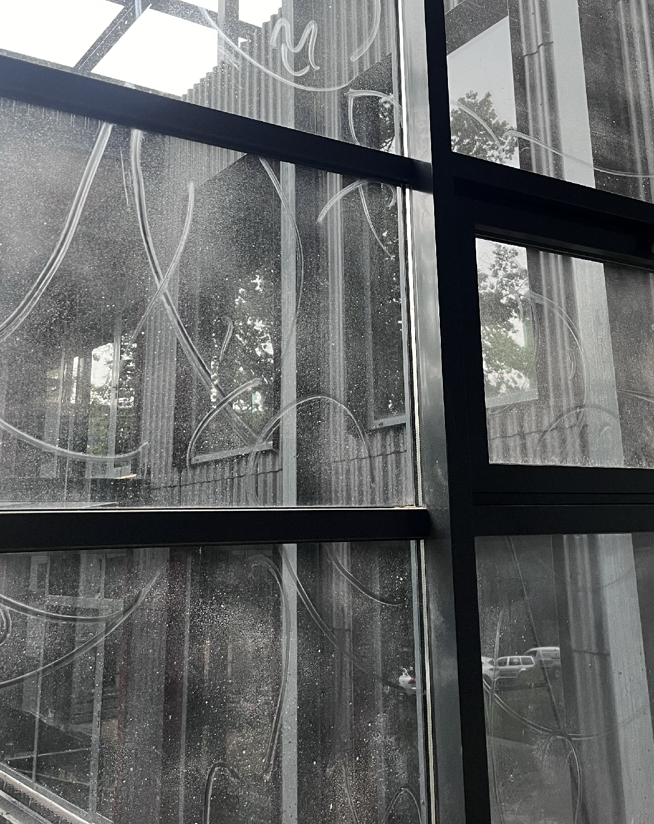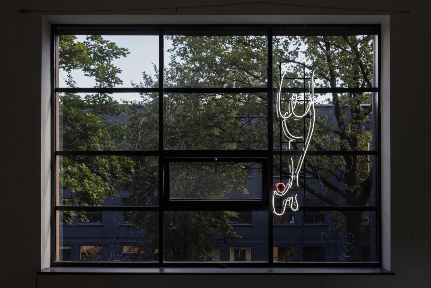 The installation consists of a neon object mounted in the windows of the exhibition hall, alongside four large-scale drawings made directly on the glass using dust and chalk